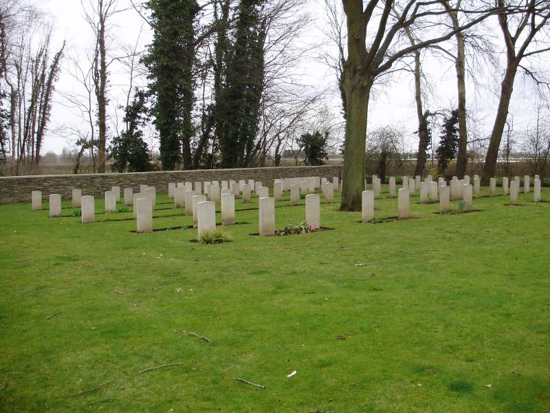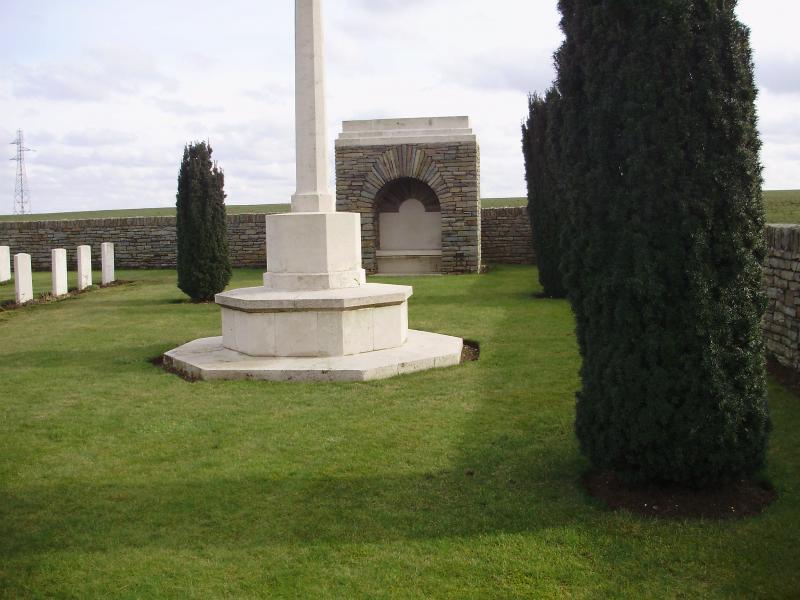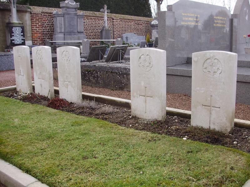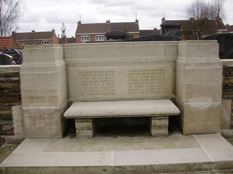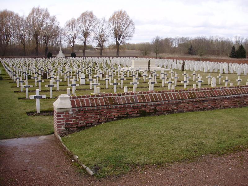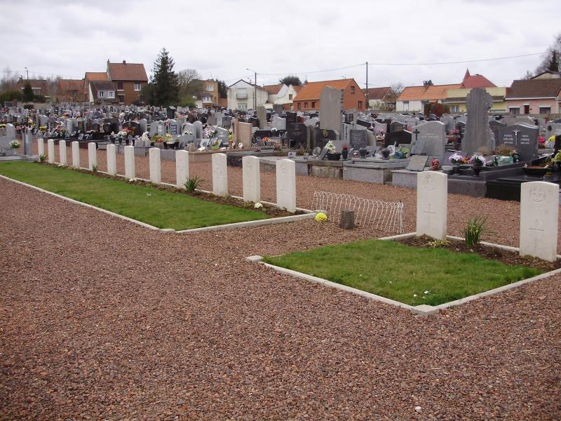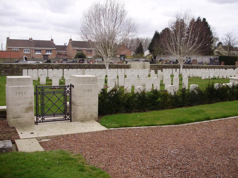 Aix-Noulette Communal Cemetery Extension. Il a une superficie de 5.203 m2 . Le cimetière a d’abord été utilisé par les troupes françaises vers 1915, par la suite il fut utilisé par les 1re et 2edivisions britanniques à partir de février 1916, avant d’être utilisé par les unités combattantes et médicales jusqu’en octobre 1918. À la fin de la guerre, on y regroupa des corps des champs de bataille de l’Est. Aujourd'hui, 1.251 soldats y reposent dont 502 français, 492 canadiens et 257 britanniques.