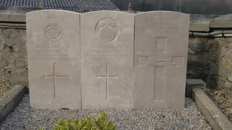 Au détour d'une petite balade, voici les tombes de 3 soldats du Commonwealth tombés en septembre 1914 durant la bataille de l'Aisne. Elles se trouvent dans un coin du cimetière communal de Filain (02).