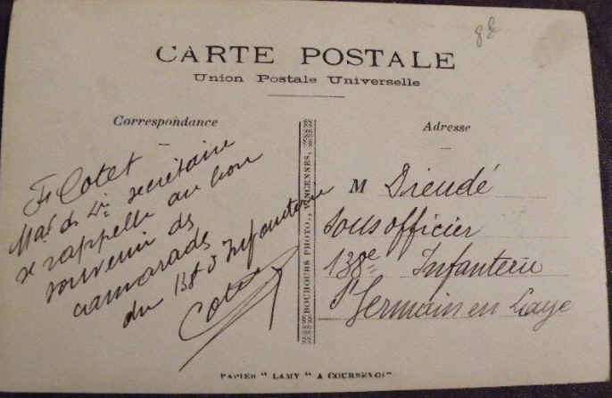(suite et fin) Et pour finir, voici le verso de cette autre carte postale, datée du 5 décembre 1918 avec cet expéditeur dont l’adresse est à l’Ecole de Cavalerie. Sous le cachet, je crois lire « détaché à la… » SNAG-014.jpg Merci de vos lumières sur cette Ecole de Cavalerie de Rambouillet, et désolé...