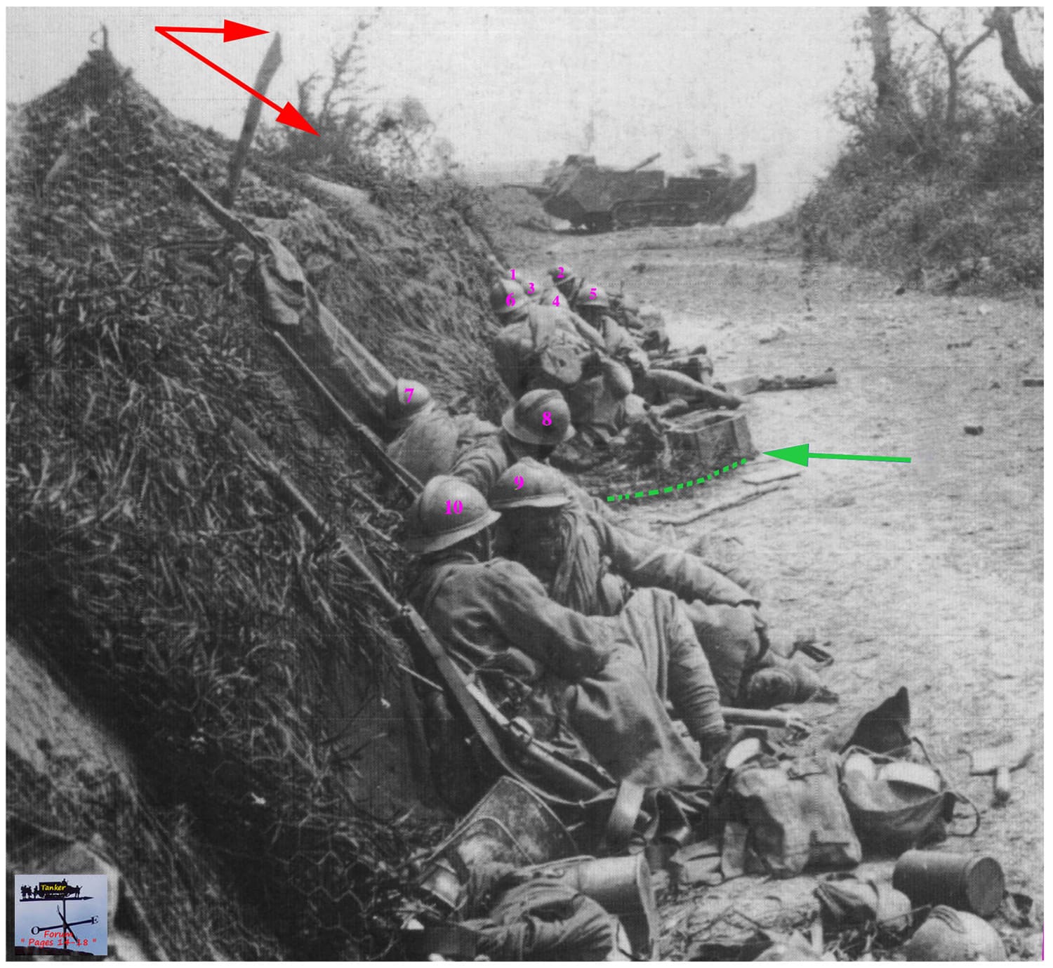 Le Sergent Jules Hème devait être le premier ou le deuxième casque visible en direction du char. Les hommes se sentaient sans doute à l'abri, protégés par le talus, les déblais de la tranchée et des abris qui longeaient la route. La première ligne allemande était à gauche de la photo dans leurs dos . . . .