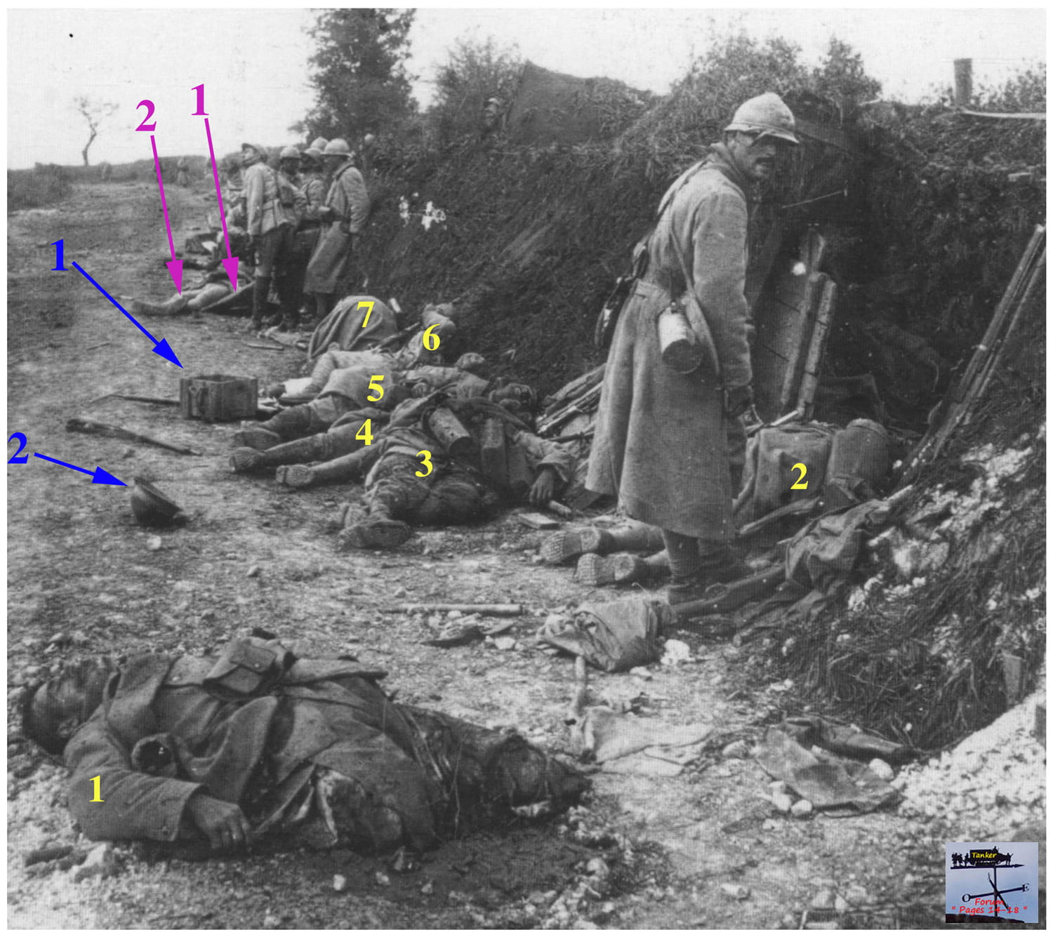 C'est en faisant des recherches qui m'ont conduit à votre forum, que j'ai appris que mon grand-oncle avait été tué lors des combats de Courcelles... Je me suis procuré sa fiche et j'ai découvert qu'il était sergent au 359° RI... Alors, vous comprendrez mon émotion quand j'ai vu la photographie de ce corps mutilé, cuisses arrachées (je me suis souvenu du geste de mon père..). En observant avec plus d'attention le cliché, en grossissant l'image; il me semble voir apparaître sur sa manche un galon de sergent (personne jusqu'ici n'y a fait référence?...) Est-ce que je me trompe... les galons à cette époque étaient bien portés sur la manche?...