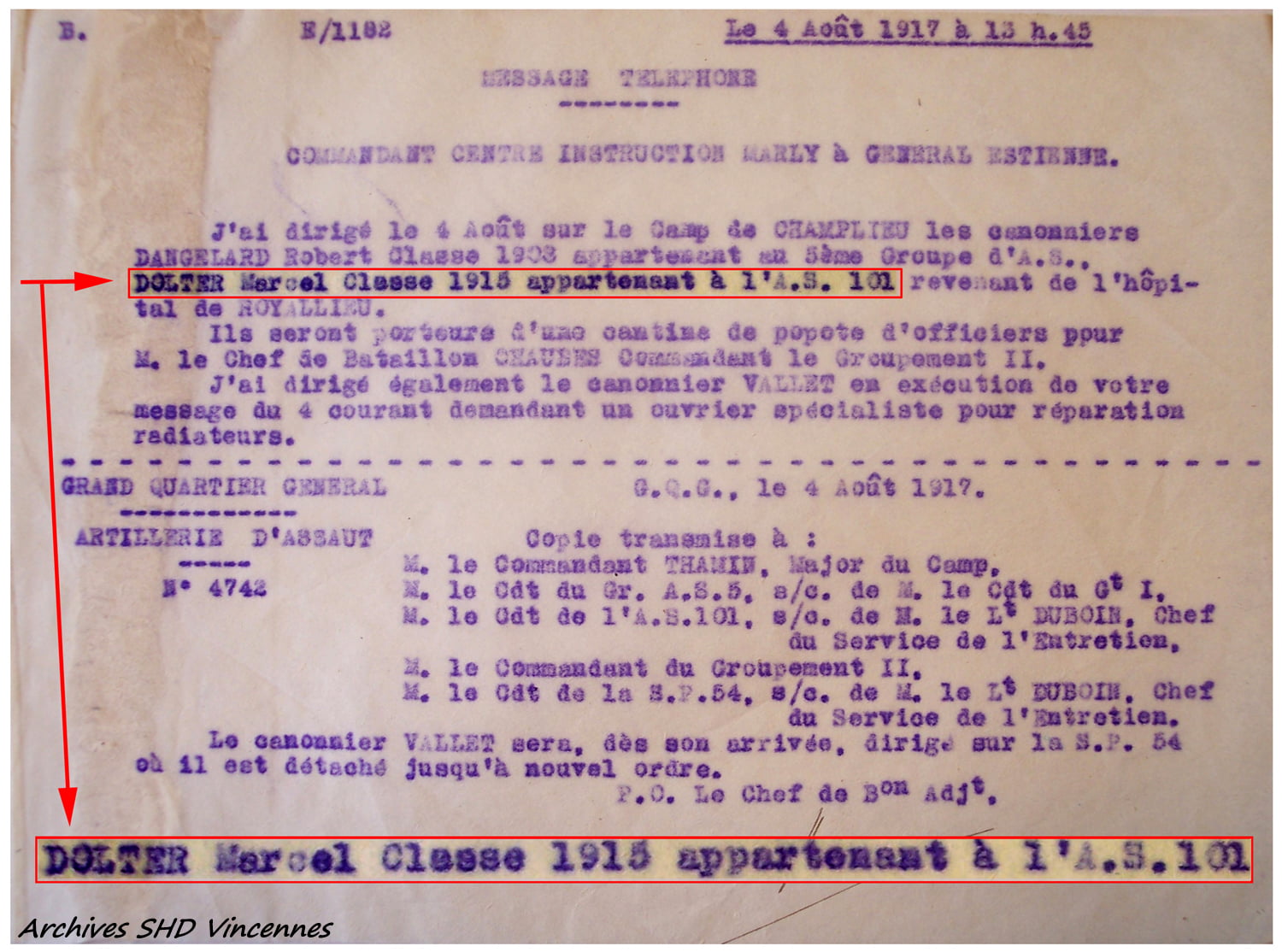 A leur lecture, il ressort qu'au moment de sa mort, ce soldat appartenait au 81° RALT depuis le 13 Septembre 1916 et, sans l'existence d'un message téléphoné, du Camp AS de Marly-le-Roi au Camp AS de Champlieu, il aurait été impossible de savoir qu'il appartenait à la SRR 101 de l'Artillerie Spéciale.