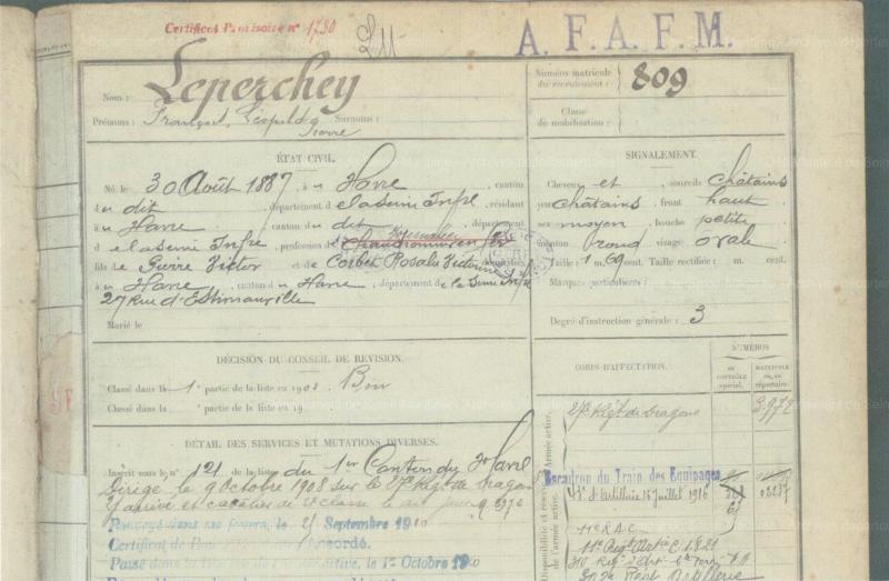 - service militaire au 27ème Régiment de Dragons du 9 octobre 1908.