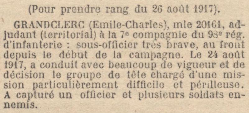 Charles Émile Grandclerc a été décoré de la Médaille militaire par un décret paru au Journal Officiel du 27 novembre 1917 (page 9546).