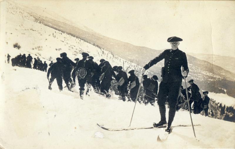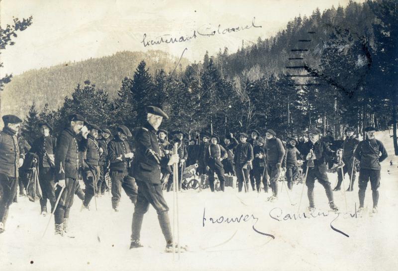 Certes, les skis du lieutenant-colonel ne sont pas des "Rossignol" dernier cri et les raquettes des artilleurs alpins n'ont pas la finesse de celles portées par des "Top Models" mais "on" n'est pas là pour s'amuser. Un brave éleveur savoyard (en chapeau melon!) a prêté deux de ses vaches pour faire glisser dans la neige ce traîneau porte-canon de circonstance.