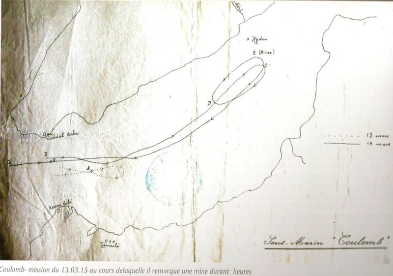 « Le 14 mars, le sous-marin Coulomb (lieutenant de vaisseau Delègue) remonte dans le détroit jusqu’à hauteur de la batterie 7 avec ordre de naviguer périscope bien haut pour attirer le feu des batteries et permettre ainsi de fixer leur position.