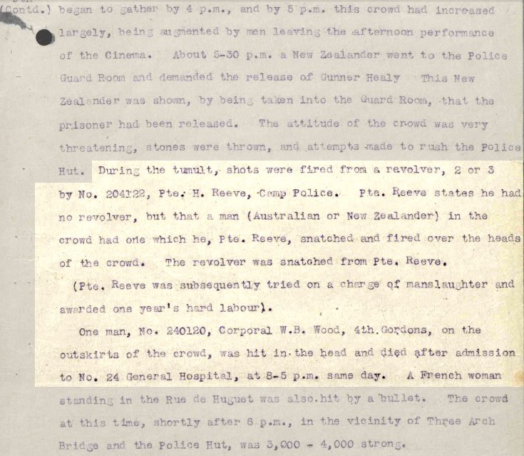 " ... la foule de soldats massée devant le poste de la police militaire vers 4 heures et 5 heures de l'après-midi a été augmentée par des hommes sortant du cinéma. À environ 5h30, un soldat néo-zélandais s'est présenté au poste des policiers et a exigé la libération de son compatriote Healy. On l'a laissé rentrer pour lui montrer qu'Healy avait déjà été libéré. L'attitude de la foule était très menaçante, des pierres volaient, certains essayaient de rentrer en force dans le poste.