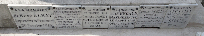 La plaque contenant le nom de Péluchon, lieutenant du 148ème, tué le 15 août 14. Promo 1904.