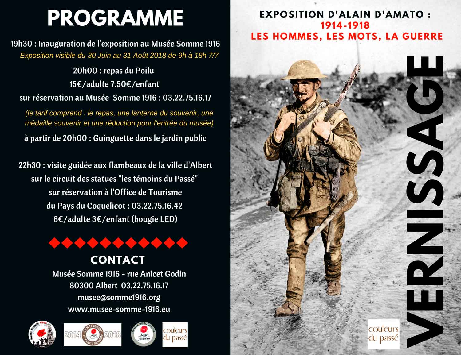 j'ai le plaisir de vous annoncer que l'exposition "1914-1918: les hommes, les mots, la guerre" issue du livre éponyme sera de passage pour la première fois dans les Hauts-de-France, au musée "Somme 1916" à Albert, du 30 juin au 31 août 2018. Cette exposition est réalisée sous forme de vidéos (elle compte 18 écrans) qui reprennent les principaux thèmes de la Grande Guerre, agrémentées de photos mises en couleur et de texte lus par des journalistes professionnels en français et en anglais. Je serai présent pour le vernissage le samedi 30 juin à 19h30 ainsi que le lendemain dimanche 1er juillet toute la journée. L'événement sera annoncé sur France 3 Picardie avec un reportage diffusé en principe le samedi. N'hésitez pas à venir nombreux, c'est TOTALEMENT GRATUIT.