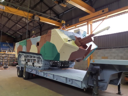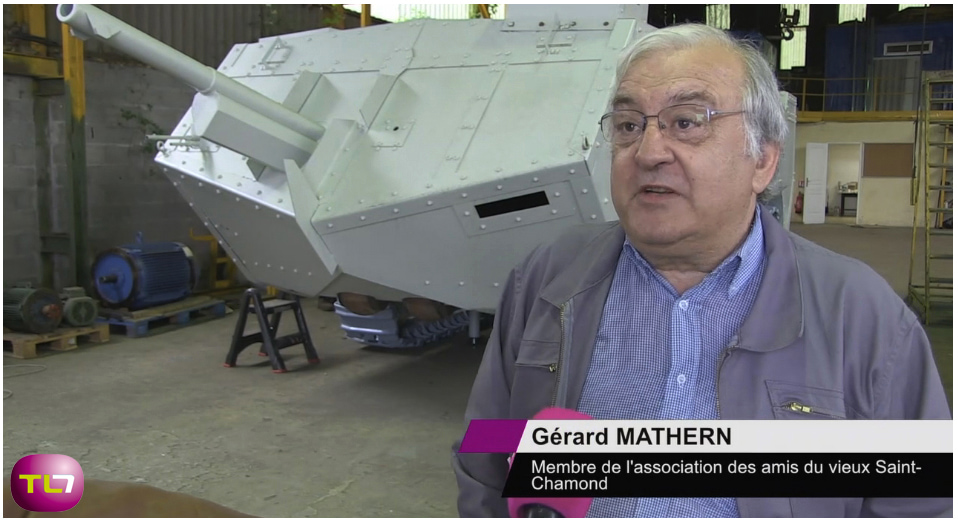 La remorque près du char est celle sur laquelle il va finalement être installé. La mairie de Saint Chamond qui sera propriétaire du char, n'a pas encore défini le point de chute définitif du char. En attendant une décision, cette solution permettra de le déplacer sans difficulté.