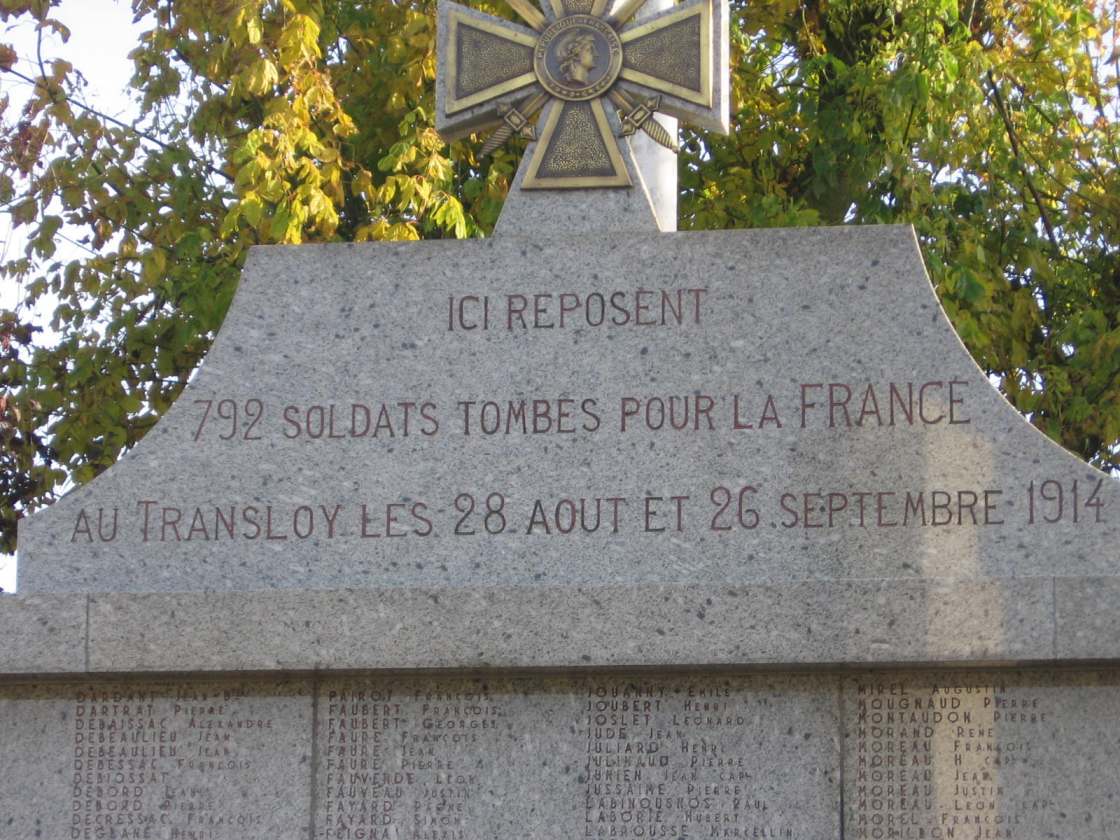 Dans le village de Le Transloy (près de Rocquigny), à côté du cimetière communal, on trouve cette stèle sur une tombe collective contenant 792 soldats dont 30 inconnus correspondants aux combats des 28 août et 26 septembre 1914.