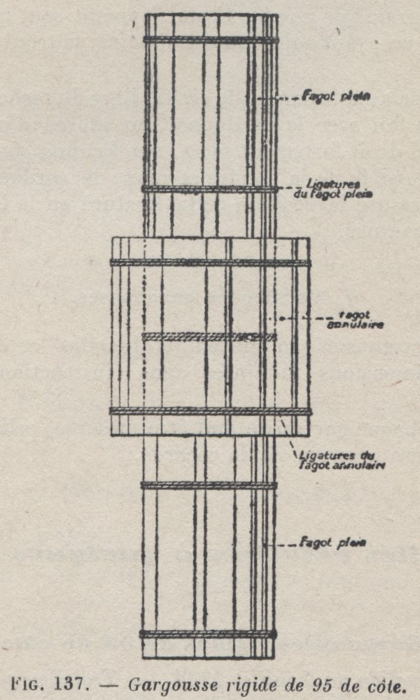 La forme particulière de la gargousse provient de l'emploi de deux fagots contenant des poudres différentes. L'un d'entre eux est un fagot annulaire entourant le fagot principal comme le montre ce schéma tiré d'un Cours supérieur des munitions de l’École Centrale de Pyrotechnie de Bourges: