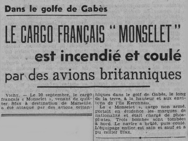 Lors du bombardement du cargo Monselet le 20 septembre 1941, il n'y a pas eu de victimes, le cargo a brûlé et a coulé.