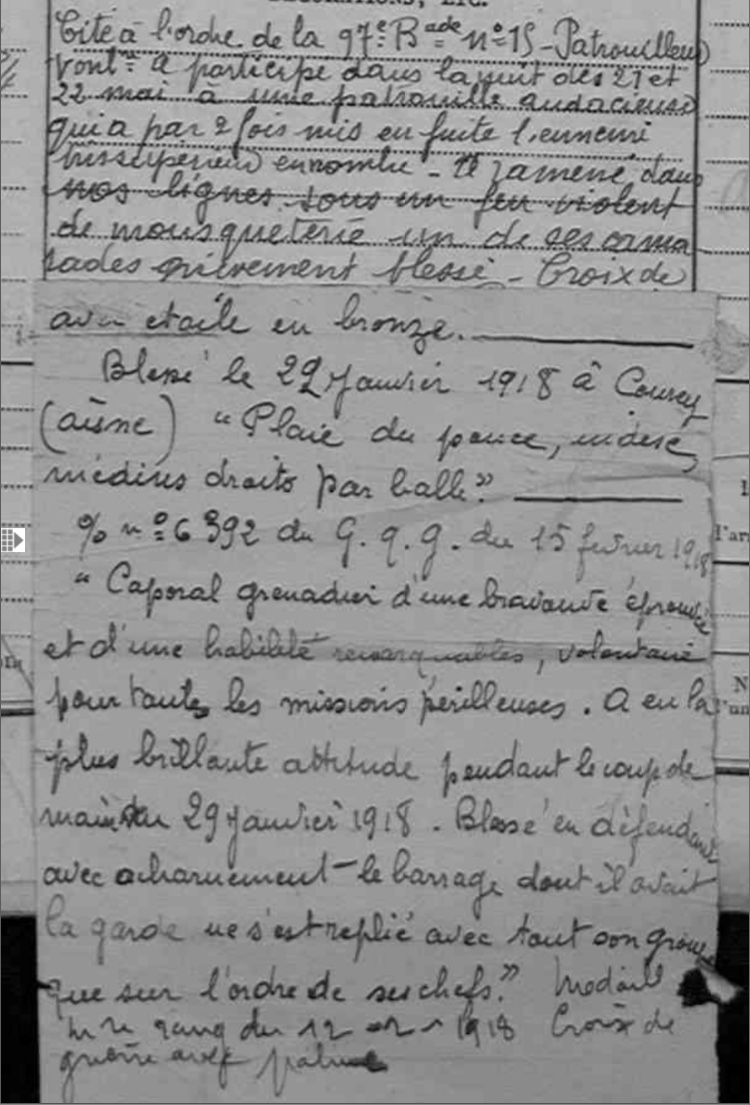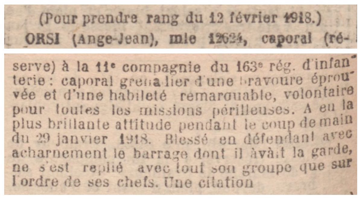 Je suis sur les traces de mon arrière arrière grand-père et souhaiterais retrouver la citation à l’ordre du Grand Quartier Général qu’il eu le 15/02/1918 si l’on s’en réfère à sa fiche matricule. J’ai lu quelque part sur ce forum que cela correspondrait à une citation à l’ordre de l’armée pour laquelle il a d’ailleurs reçu la médaille militaire. Cela peut-il faire l’objet d’une publication au Journal Officiel ou ailleurs étant donné que c’était un homme du rang? Je n’ai rien trouvé jusque là mais je m’y prends certainement mal car je suis novice et ne sais pas trop comment et où chercher. Je mets en pj la copie de sa fiche matricule avec la citation et le numéro de la citation. Il s’appelait Ange-Jean ORSI né le 24-04-1895. Merci de votre aide.