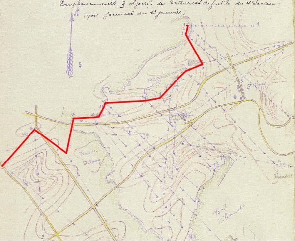 Voici le croquis avec le cadre de vos 3 photos plus un cercle jaune où je suppose, en dilettante, approximativement avoir été blessé grièvement Maurice Genevoix :