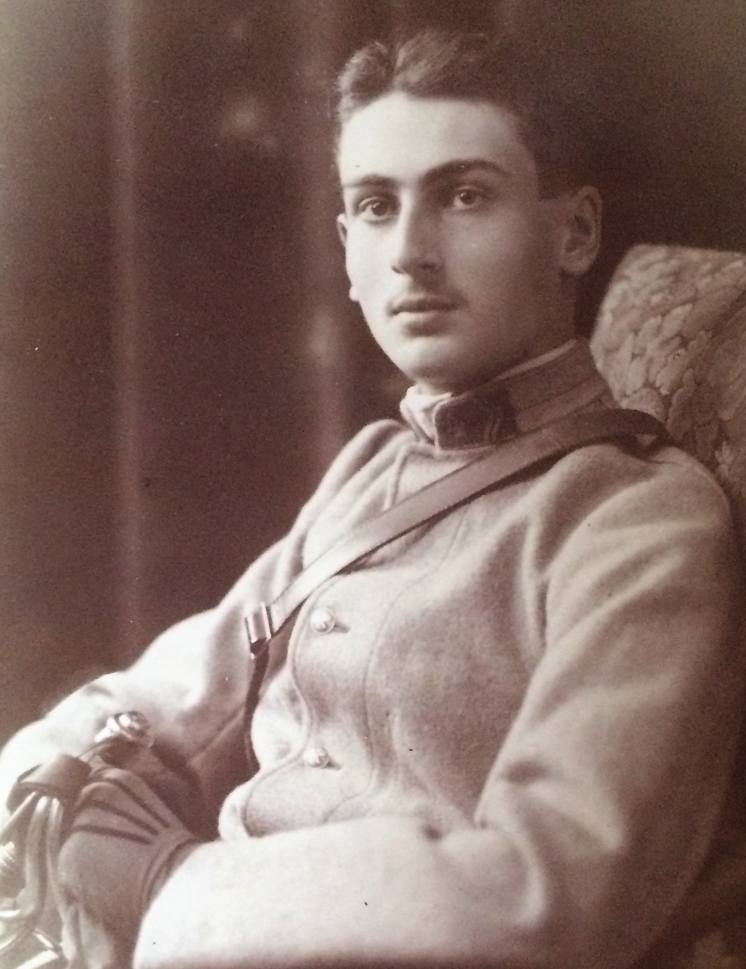 Je verrai bien un ephoto prise entre juin et decembre 15 lorsqu'il est élève offcier à Fontainebleau, logiquement il devrait porter encore les attribut de son ancien corps, il a un sabre et ses gants ne sont pas ceux de la troupe, au "feeling" je verrai cette phot prise avant sa nomination au grade d'aspirant