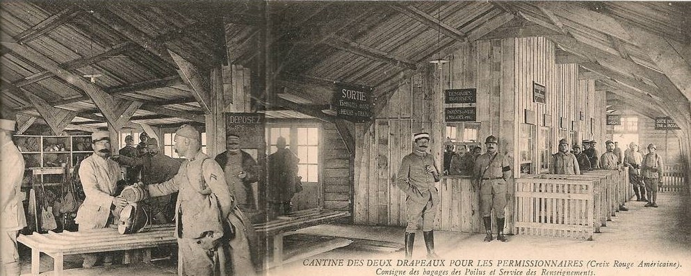 Je crois savoir que près des gares de triage importantes qui voyaient se croiser chaque jour des centaines de poilus permissionnaires, il y avait ce genre de "cantines" pour les soldats qui attendaient leurs correspondances où ils pouvaient manger, dormir, se divertir et peut-être boire de manière plus ou moins raisonnable. Certaines portaient le nom de "foyers" et étaient financés par des organisations de bienfaisance.