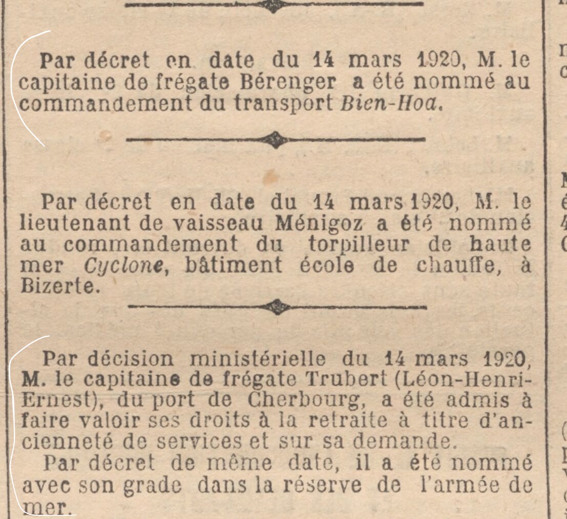 C'est le capitaine de frégate Bérenger qui l'a remplacé depuis le 14 mars 1920.