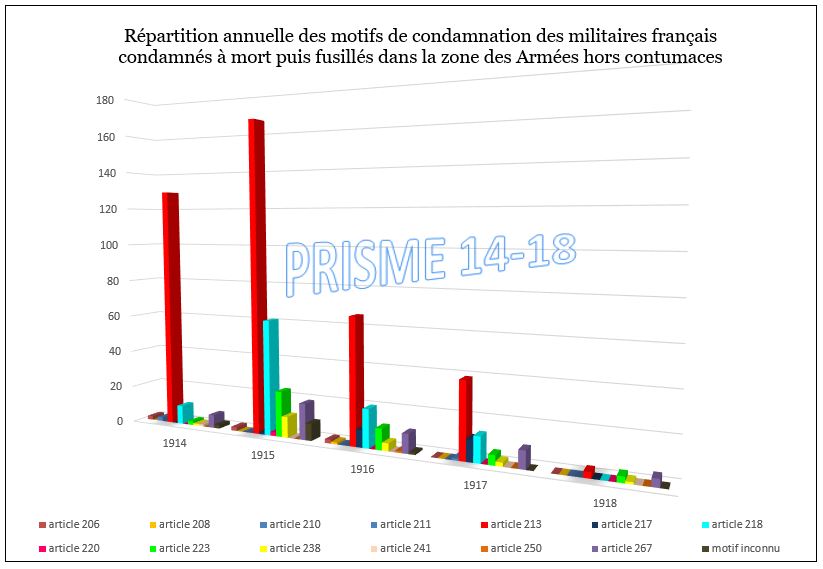Nous avons ajouté un nouvel histogramme illustrant annuellement l’évolution des motifs de condamnation à mort des militaires français fusillés par les conseils de guerre temporaires hors contumaces.