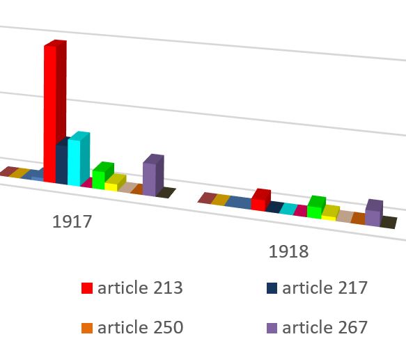 Petit extrait ciblant l’année 1918 pour montrer les motifs de condamnation au cours d’une période où la justice militaire fonctionnait comme en temps de paix. On constate 3 abandons de poste (article 213) en rouge sur l'extrait, une désertion à l’ennemi (article 238) en jaune sur l'extrait, 4 crimes sanctionnés par le code pénal (article 267) en violet sur l'extrait et 3 voies de fait envers un supérieur (article 223) en vert clair sur l'extrait.