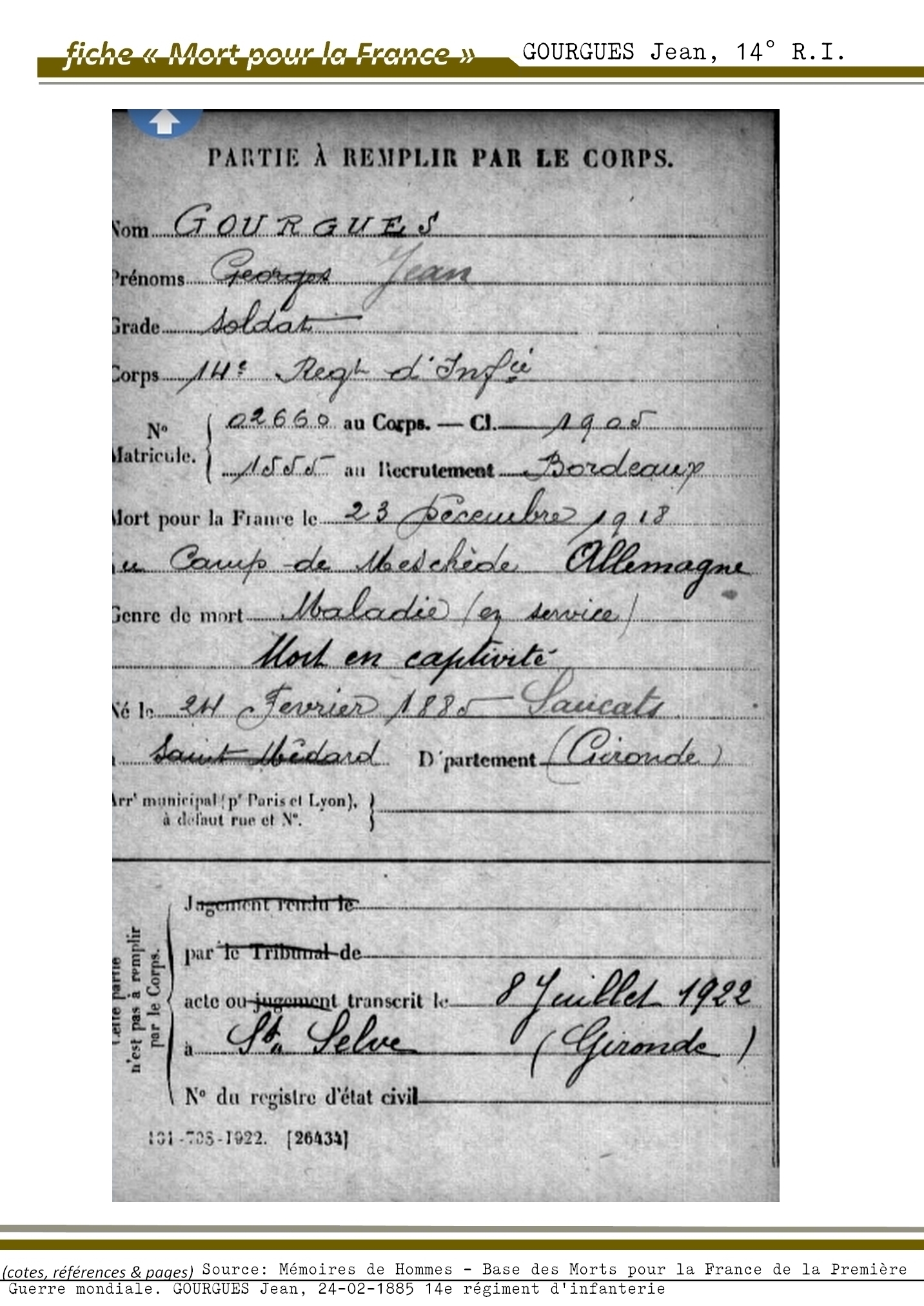 Sa fiche matricule, conservée aux AD de Bordeaux (https://archives.gironde.fr/ark:/25651/ ... tion=0.000) j'apprends que Jean (appelé Georges en famille) Gourgues est porté disparu le 9 mars 1916 à Cumières (55). Confirmé par avis ministériel en date du 19 avril 1916.