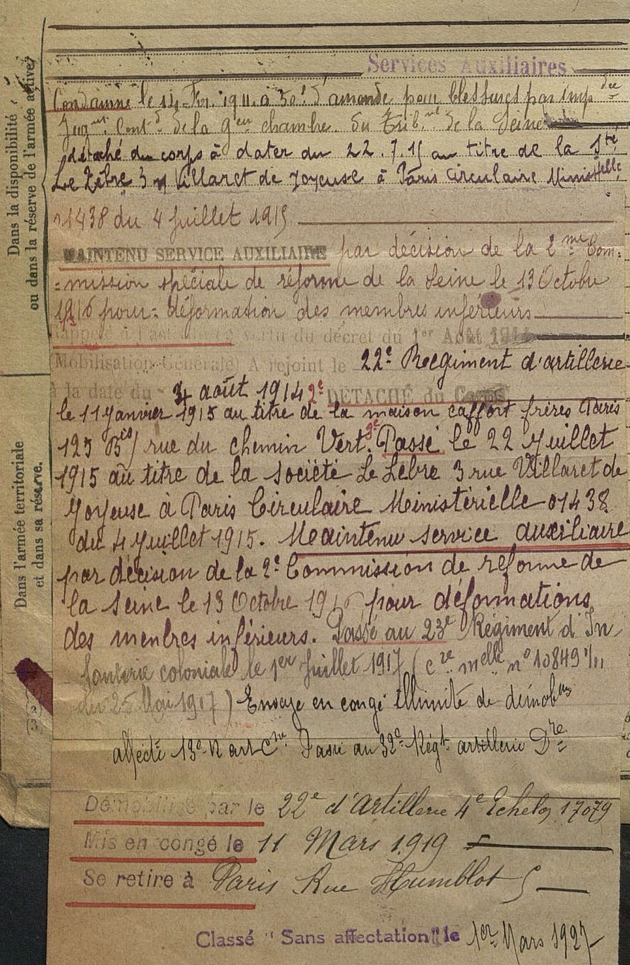 Merci pour cette information. Mais comment un homme qui présentait une informité conséquente a-t-il pu être affecté dans l'infanterie coloniale ? Puis-je envisager qu'il soit resté à Paris, comme auxiliaire de son régiment, avant d'être démobilisé de façon définitive ? (Bien qu'il y ait deux autres affectations dans des régiments d'artillerie qui sont mentionnées après sa démobilisation.)