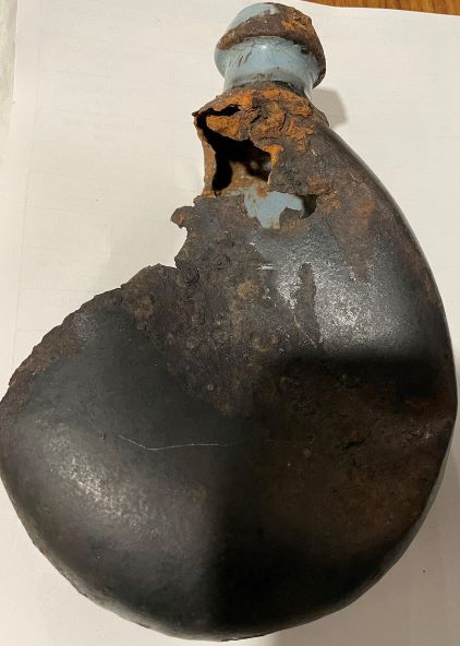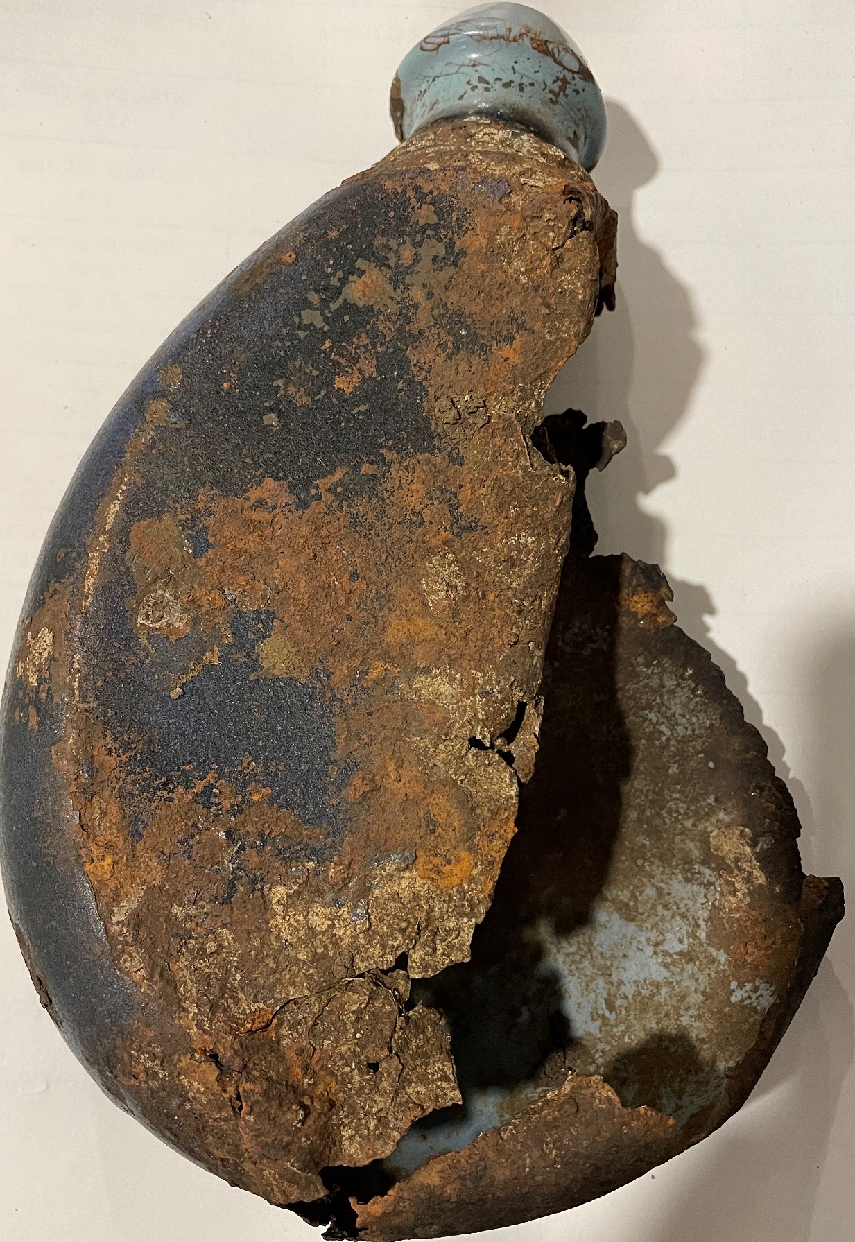 Le premier est un vestige de bidon allemand en fer émaillé bleu (il existe une grande variété de teintes), typique des fabrications de guerre.