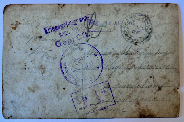 La photo 2 est une carte postale adressée à Mathurin Laigo (son cousin, mon arrière-grand-père) de Nerhuilec et datée du 18 juillet 1916. On lit en haut à gauche « Hémon Victor ». Dans les tampons en allemand, on peut lire :