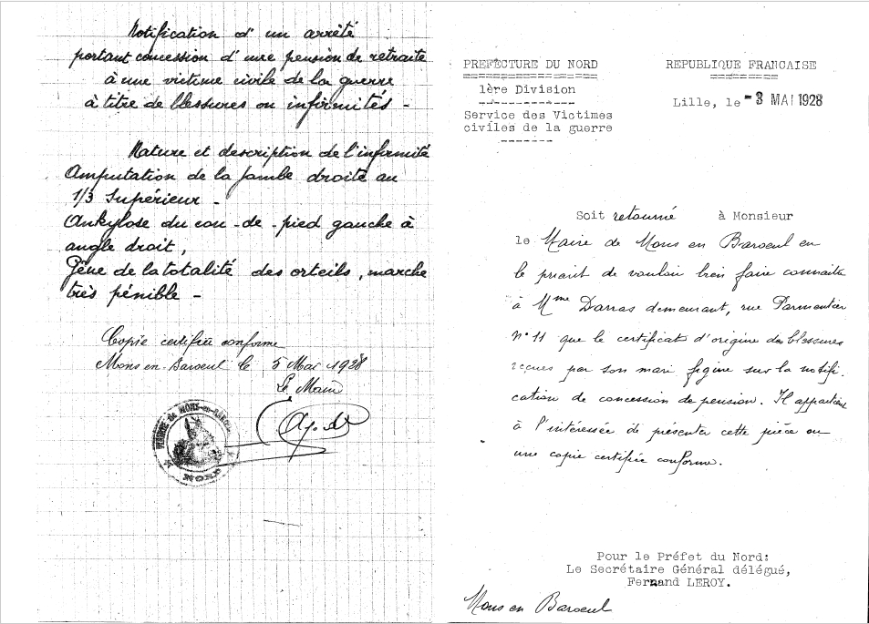 J’ai eu hier une réponse où il est indiqué qu’il a eu son amputation de la jambe gauche en tant que « victime civile de la guerre » voir fichier joint
