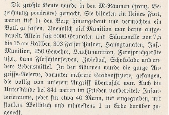 [ ...Le plus gros butin a été réalisé dans les salles de munitions (terme français : « poudrière »). Ils formaient un petit fort, construit au plus profond de la montagne et pouvant contenir un bataillon entier. Une quantité infinie de munitions était empilée à l’intérieur. Près de 6 000 grenades et éclats d'obus de calibre 7,5 à 15 cm, 303 barils de poudre, des grenades à main, des munitions d'infanterie, 250 fusils, des munitions lance-fusées, des appareils téléphoniques, etc. À cela s'ajoutent des conserves de viande, des biscottes, du chocolat et d'autres denrées alimentaires. L'ensemble de la réserve d'attaque (française) - y compris plusieurs officiers d'état-major - était fait prisonnier dans les salles. Ils ont été complètement surpris par notre attaque. Les abris du point 841 étaient également des salles d'infanterie préparées en temps de paix. Chaque salle contenait environ 40 hommes. Les salles étaient profondément enfoncées dans le sol et recouvertes de tôle ondulée solide et d'au moins 1 mètre de terre. ...]