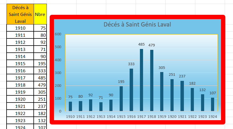 En attendant de vous énoncer le principal de ce que l'étude du dossier nous révèle, vous trouverez en pièce jointe, un graphique faisant le point sur l'évolution des décès entre 1910 et 1924 à Saint Génis Laval.