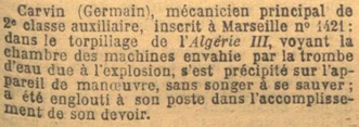 — CARVIN Germain Antoine, né le 16 janvier 1878 à Marseille (Bouches-du-Rhône). Mécanicien principal de 2e classe auxiliaire, inscrit au quartier de Marseille, n° 1.421 ; classe 1898, n° 1.860 au recrutement de Marseille.
