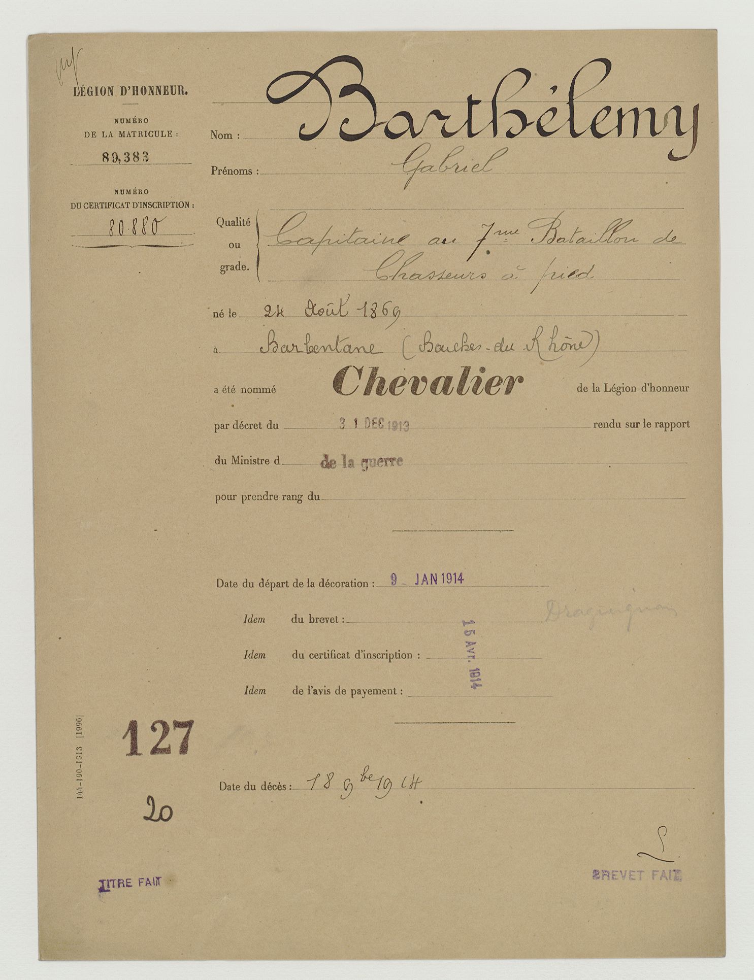 A moment de sa présentation devant le conseil de révision de Châteaurenard (Bouches-du-Rhône), Gabriel BARTHÉLÉMY demeure à Gardanne où il exerce la profession d'instituteur. Le n° matricule au recrutement 555 lui est alors attribué.