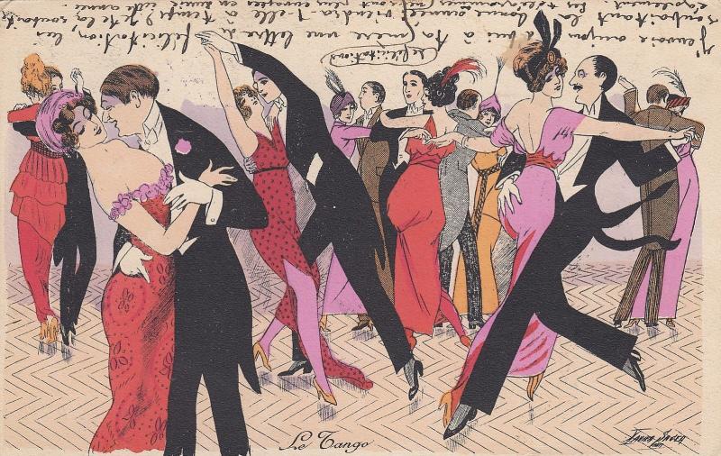 Carte postale dessinée: danseurs de Tango (Xavier Sager - 1915).