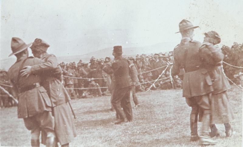 Hommes et femmes du contingent dansant ensemble. Etaples-sur- mer (62) (?)