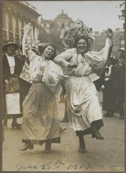 Femmes dansant entre elles pour célébrer le retour des soldats.