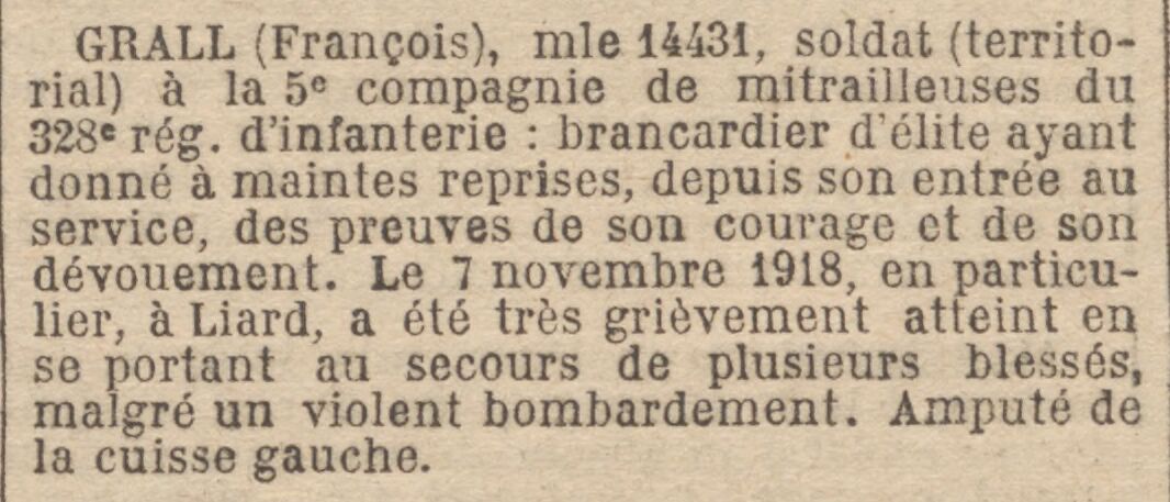 GRALL (François), matricule 14431, soldat (territorial) à la 5e compagnie de mitrailleuses du 328e régiment d'infanterie : brancardier d'élite ayant donné à maintes reprises, depuis son entrée au service, des preuves de son courage et de son dévouement. Le 7 novembre 1918, en particulier, à Liard, a été très grièvement atteint en se portant au secours de plusieurs blessés, malgré un violent bombardement. Amputé de la cuisse gauche.