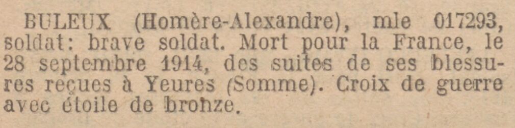 CARPENTIER (Henri-Félicien), matricule 012766, soldat : a toujours servi en brave et excellent soldat, donnant en toutes circonstances la valeur de son dévouement. Tombé glorieusement pour la France, le 18 octobre 1916, à Berny-en-Santerre (Somme). Croix de guerre avec étoile de bronze.
