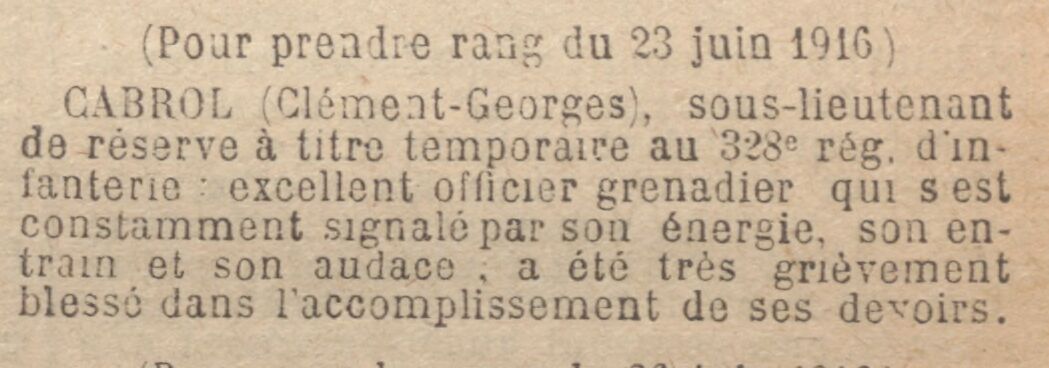 Le Colonel Cdt le secteur est heureux de constater une fois de plus, la vigueur, le calme et le sang-froid montrés au cours de ces alertes par le 328e d'infanterie. Il félicite les braves troupes qui n'en sont pas à leur coup d'essai, particulièrement les Commandants... les sous-lieutenants..., ainsi que l'Adjudant CABROL dont l'énergie et la bravoure servent d'exemple à leurs courageux soldats."