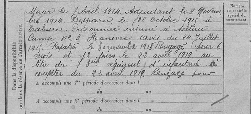 Il est mentionné ensuite : Prisonnier interné à Seltau Camps n° 3 Hannovre. Avis du 24 juillet 191? (1915 à priori mais peut-être est-ce 1919 car juillet 1915 serait entérieur à octobre ; donc un avis avant date où il est porté disparu ?).