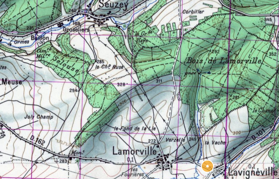 à la page 53 /121 du JMO duquel vous avez tiré votre carte, il y a une autre carte qui est la partie Est de votre carte (partie droite)...on y voit le bois de Lamorville. Le raccord des deux cartes c'est le "bois des Mélèzes". .