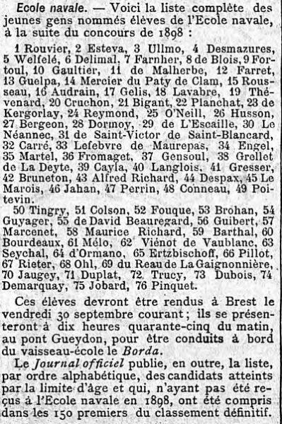 Candidats admis à l’École navale à la suite du concours organisé en 1898