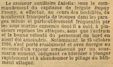 Après guerre, ce bâtiment fut cité à l'ordre de l'armée dans les termes suivants (J.O. 13 déc. 1919, p. 14.469) :