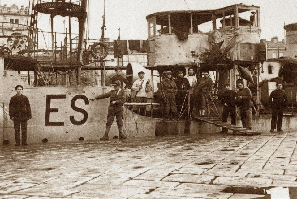 Une photo de 1919; à droite le torpilleur italien Giuseppe Cesare Abba (marque AB); à gauche le long de la digue l'esploratore (grand torpilleur) Carlo Mirabello et le dreadnought Dante Alighieri.