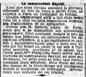 Le 7 novembre 1918, elle reçoit la visite, à l'hôpital auxiliaire 63, du commandant Raynal : source : Le Salut Public, 7 novembre 1918, page 2, site internet lectura.plus