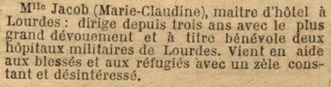 □ Par décret du 18 février 1919 (art. 3 ; J.O. 20 févr. 1919, p. 1.870 et 1.881), la Médaille de la Recon-naissance française (Bronze) fut conférée dans les termes suivants à Mademoiselle Marie Claudine JACOB :