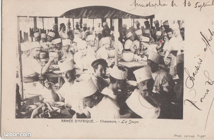 Une acquisition récente d'une carte postale prise à Alger au quartier Mustapha du 5e RCA lors de la soupe.
