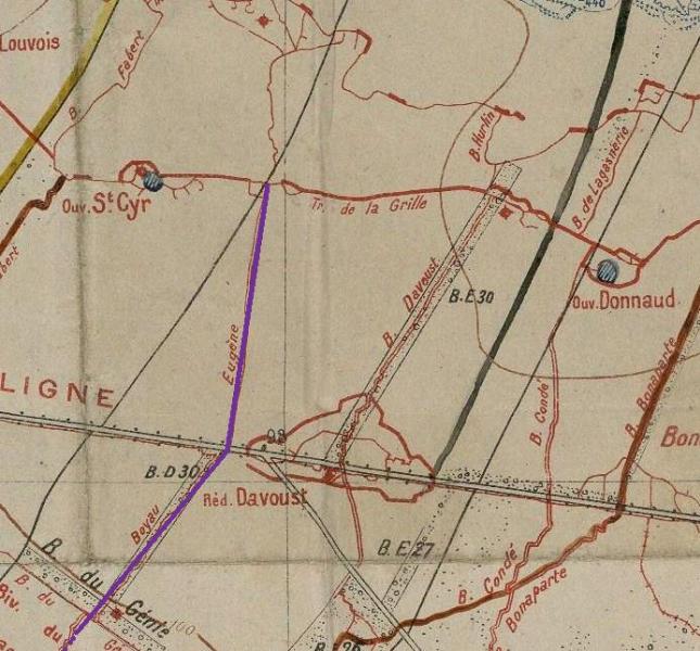 Sur cet extrait de carte, le boyau Eugène (trait violet) est un peu à gauche du réduit Davoust, un peu après le croisement de la D35 et de la D931 (voie romaine) en direction de Reims. Donc pas tout à fait à l'emplacement de la stèle qui elle, semble être en lieu et place du boyau davoust.