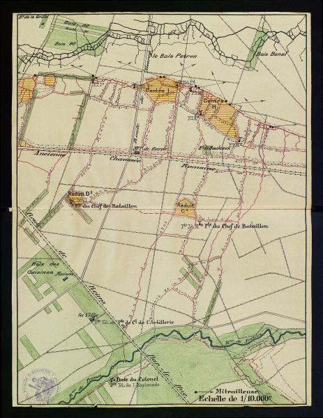 Quelques précisions sur le réduit Davoust.Sa construction par le 117RI a commencé à la mi-juillet 1915 suite à la note du 20 juin du G.Q.G.Il était très grand,environ 310X160m,ce qui met la pointe du saillant nord à 120m de la Voie Romaine.La stucture en demi hexagone visible sur Google ne devait donc être que le PC fortifié.Je crois a voir les photos d'Achache que l'agriculteur l'a fait disparaître (à vérifier).Seule resterait la bizarre parcelle de 25X14 environ dont la cause est peut-être à rechercher sur un ancien cadastre.L'entrée d'un boyau compte tenu des kms de tranchées et boyaux complètement disparus autour comme sur tout le front me paraît peu probable.