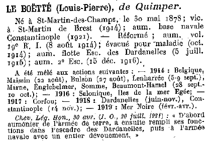 Entre dans la Marine en 1884. Aspirant le 5 octobre 1887. De 1887 à 1889, campagne d'Extrême-orient sur le "TURENNE" et le "VILLARS". Enseigne de vaisseau le 5 octobre 1889 (port CHERBOURG). En 1890 sur le transport "DURANCE", campagne du DAHOMEY. En 1891, sur le cuirassé "AMIRAL-BAUDIN" en Méditerranée. En 1892, Officier de manoeuvre sur le "BENGALI", Station des ANTILLES et de CAYENNE. En 1894, sur le croiseur "ALGER" en Extrême-Orient. Lieutenant de vaisseau le 10 juin 1896. Au 1er janvier 1897, Second sur le contre-torpilleur "CASSINI", Escadre du Nord(Cdt Eugène SURCOUF). Officier breveté Torpilleur. Au 1er janvier 1899, à l'École supérieure d'électricité de PARIS, 14 rue de Staël. En 1900, affecté à la Direction des défenses sous-marines à TOULON. Aux 1er janvier 1901, 1902, sur le croiseur "DUGUAY-TROUIN", École d'application des Aspirants (Cdt Pascal HOUETTE). Officier breveté de l'École Supérieure de la Marine, promotion 1903, à PARIS. En janvier 1904, sur le "BRENNUS", Aide de camp de l'amiral JAURÉGUIBERRY, Commandant l'Escadre de réserve. Mêmes fonctions auprès de l'Amiral FOURNIER, pendant les manoeuvres de 1905. En 1906, Commandant le torpilleur "MOUSQUETAIRE", Division de l'ALGÉRIE. Capitaine de frégate le 10 juillet 1909. Au 1er janvier 1911 (nomination de 1909), Second sur le "BORDA", École navale en rade de BREST (Cdt Paul DE GUEYDON). En 1911, Commandant le transport "BIEN-HOA". En 1914, sur le "JULES-MICHELET". En 1915, sur le "WALDECK-ROUSSEAU". Capitaine de vaisseau le 12 décembre 1915. Commandant les cuirassés "DIDEROT" (de décembre 1915 à décembre 1916) et "CONDORCET" (de janvier 1918 à septembre 1919), jusqu'à la fin des hostilités. Officier de la Légion d'Honneur le 17 janvier 1917. --- Cet Officier sera nommé Contre-Amiral en septembre 1919. En octobre il commande et remet en ordre de marche l'École Supérieure de la Marine après l'interruption pendant la guerre... Il sera Préfet maritime du 4ème arrondissement à ROCHEFORT. Vice-Amiral en novembre 1925, Préfet maritime du 5ème arrondissement à TOULON. Il quitte le service actif en 1928.
